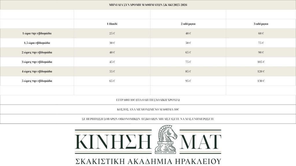 Για σοβαρές οικονομικές δυσκολίες μη διστάσετε να μας ενημερώσετε ώστε να βρούμε την καλύτερη δυνατή λύση. Θεωρούμε ότι όλα τα παιδιά πρέπει να έχουν πρόσβαση στο σκάκι και δεν πρέπει να είναι ο οικονομικός παράγοντας η μόνη αποτρεπτική αιτία.
