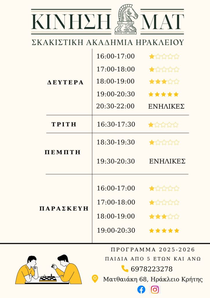 Η σκακιστική μας ακαδημία βρίσκεται στην οδό Ματθαιάκη 68 στο Ηράκλειο Κρήτης, μπορείτε να βρείτε την τοποθεσία στον χάρτη πατώντας ΕΔΩ.