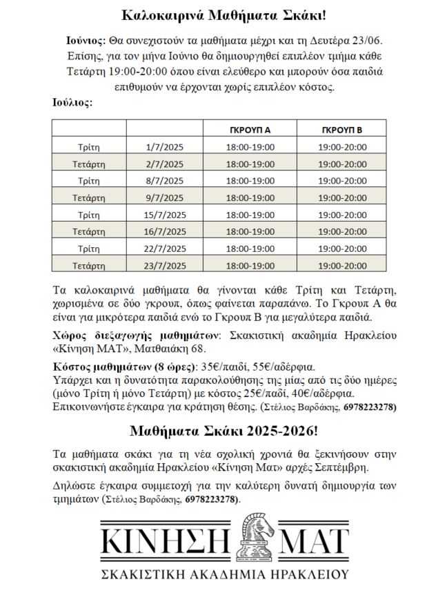 Πιο συγκεκριμένα, τα καλοκαιρινά μαθήματα θα διεξαχθούν στην έδρα της Σκακιστικής Ακαδημίας Ηρακλείου “Κίνηση ΜΑΤ” (Ματθαιάκη 68, Ηράκλειο), από 01 έως 23 Ιουλίου κάθε Τρίτη και Τετάρτη.